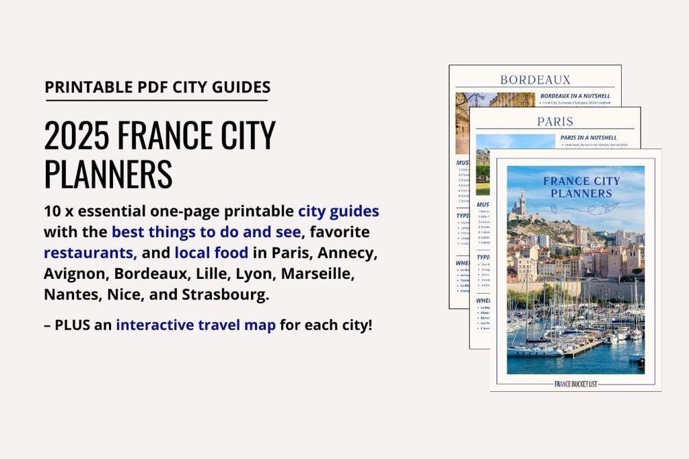 Set of 10x essential one-page printable planning checklists with the best things to do, see, and experience in Paris, Annecy, Avignon, Bordeaux, Lille, Lyon, Marseille, Nantes, Nice, and Strasbourg PLUS the local specialties (and where to eat them!).